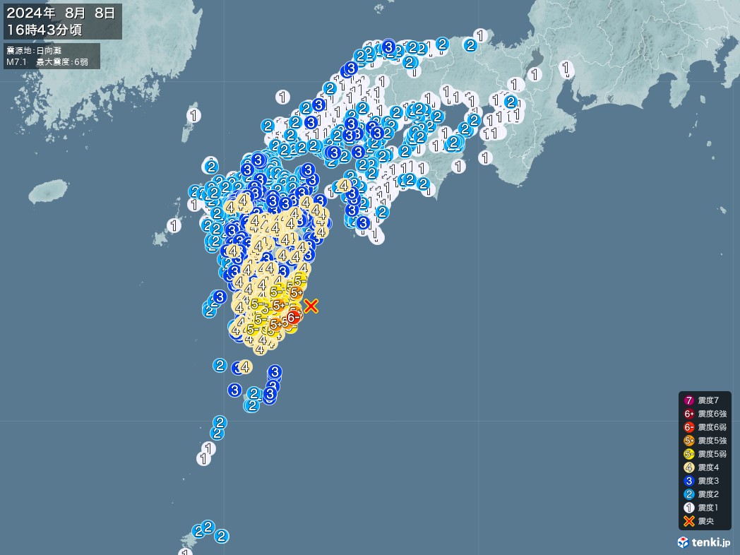 2024/08/08 16:42 日向灘 震度6弱 M7.1 予測情報検証